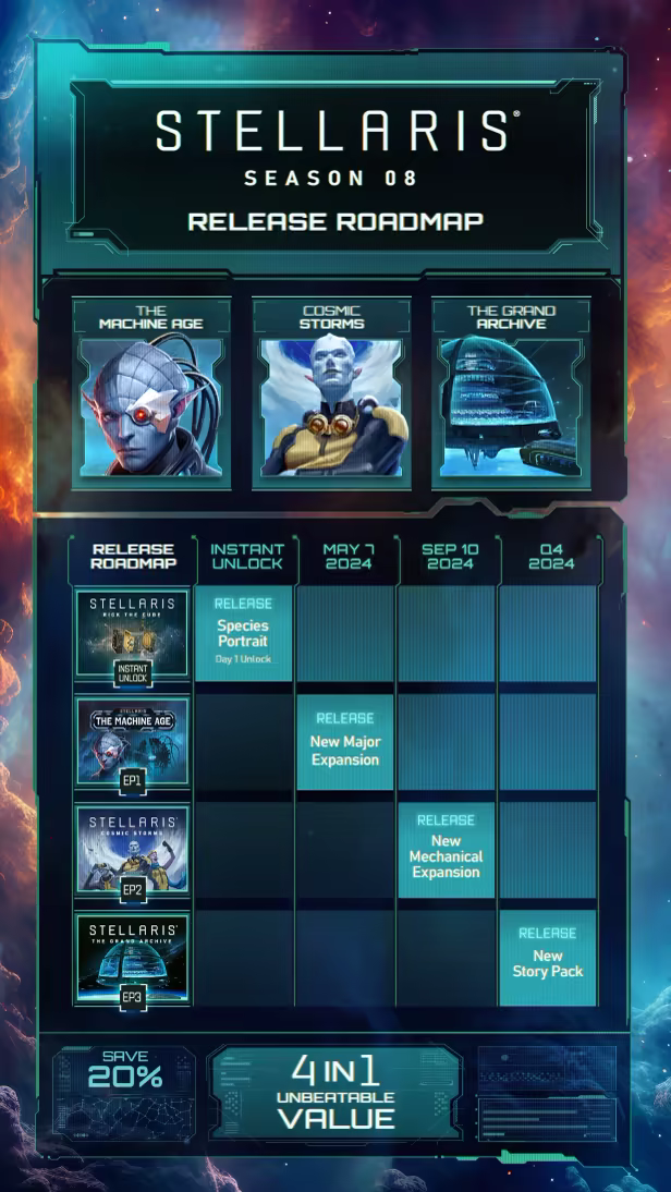 An exclusive portrait for your species, to play as the most enigmatic species in the galaxy. As every Stellaris Species Portrait, it comes with three different variants (phenotypes) and custom animations. Players will be able to select this portrait in the empire creation skin before starting a new game session.Instant, exclusive access when buying the Expansion Pass (Stellaris: Season 08).